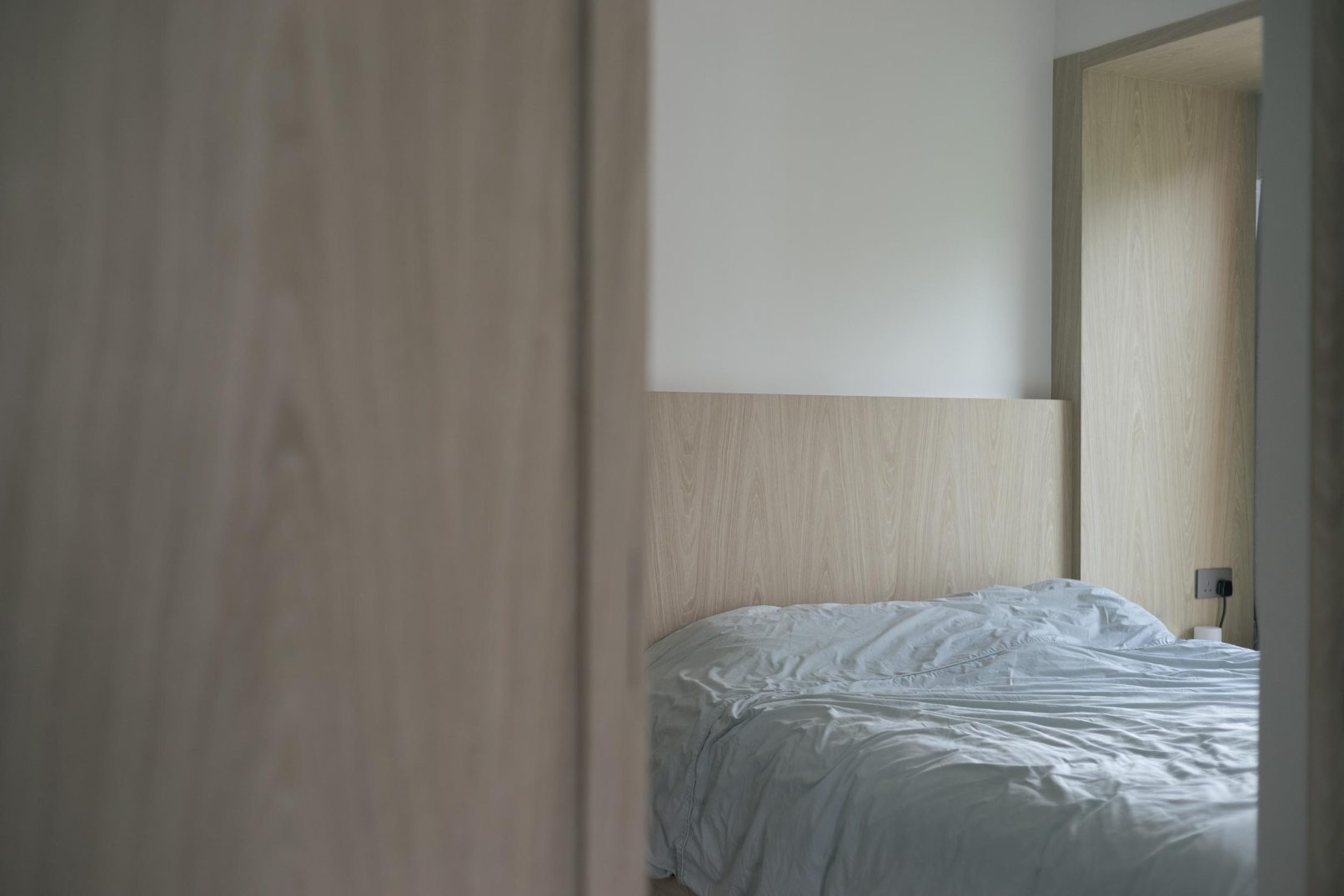 The studyroom is located at the back of the apartment and features a large, built-in wardrobe. The wardrobe is made of the same wood with leather finish, which helps to tie the space together. The bed is positioned against a wall with a large window, which provides plenty of natural light.